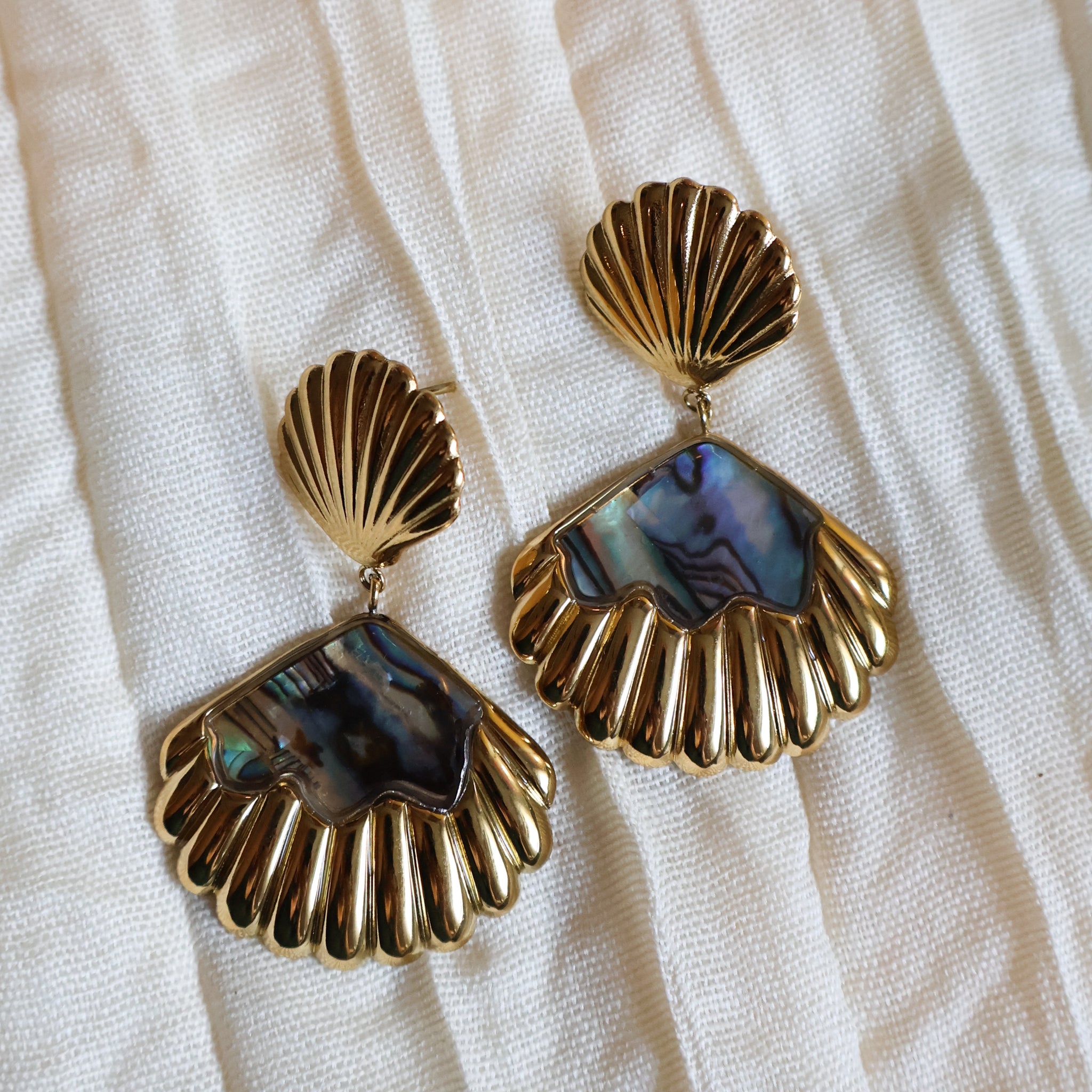 Lustrous and ocean-inspired. These earrings feature a delicate abalone shell inlay, shimmering with iridescent blues, greens, and purples. They sit comfortably on the ear, adding a subtle touch of coastal elegance to any outfit.