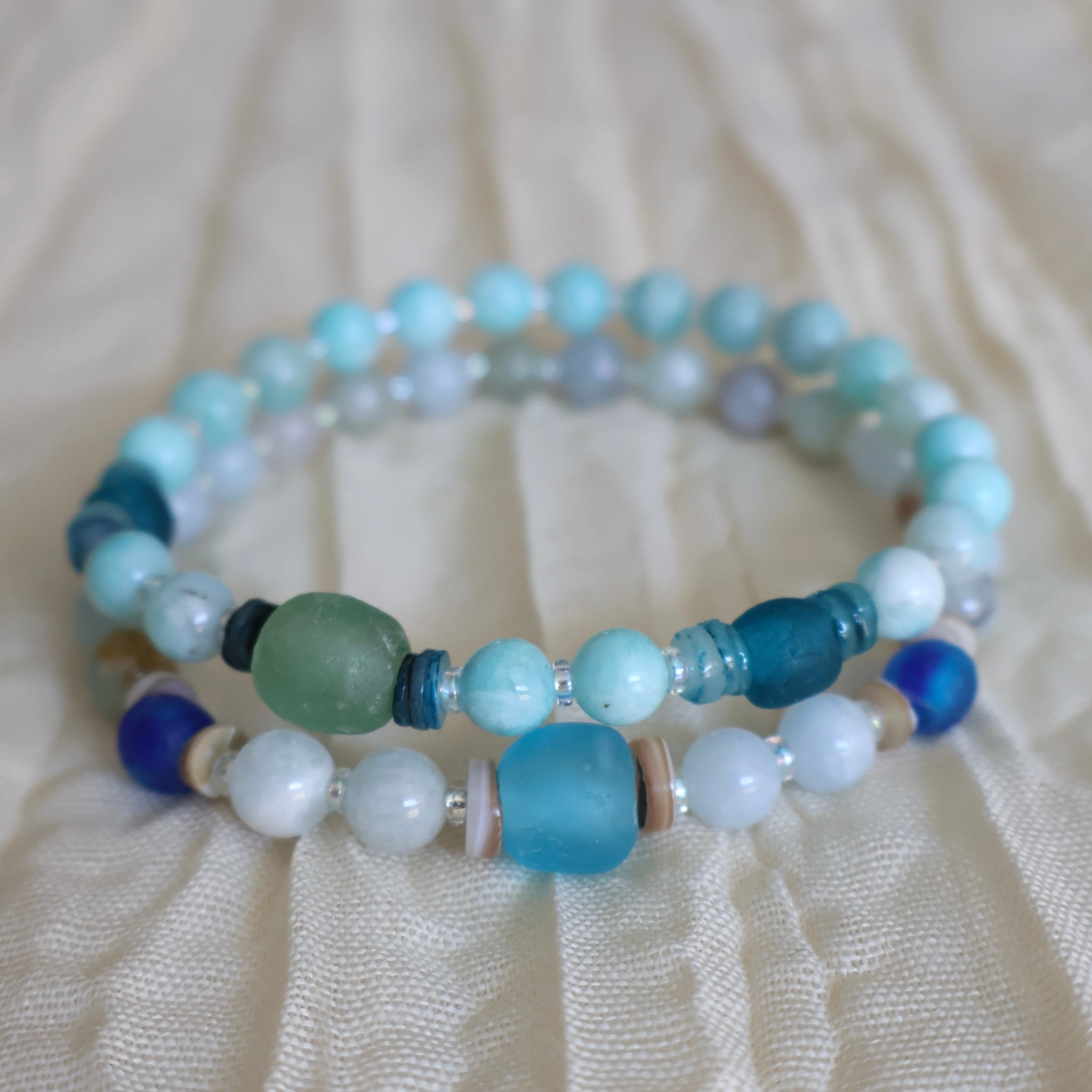 A two-bracelet set designed for ocean lovers who don’t want to wait for summer to feel close to the shore. Amazonite and aquamarine bring that soft sea-foam color palette. Natural shell catches the light like a tidepool at sunrise. Recycled glass beads add that beach-wanderer charm and tell a story of sustainability.