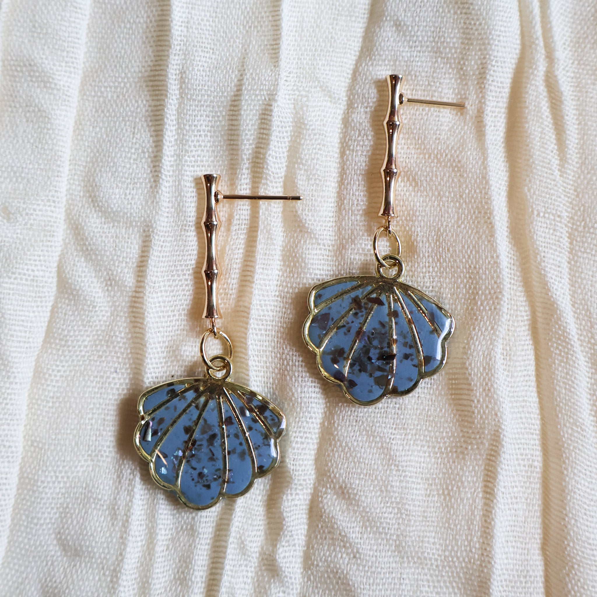 Soft, breezy, and full of coastal charm. These dark blue polymer clay earrings hold tiny, real crushed shells inside, giving each piece a little pocket of the ocean. They have gold stainless steel studs and move gently with every step.
